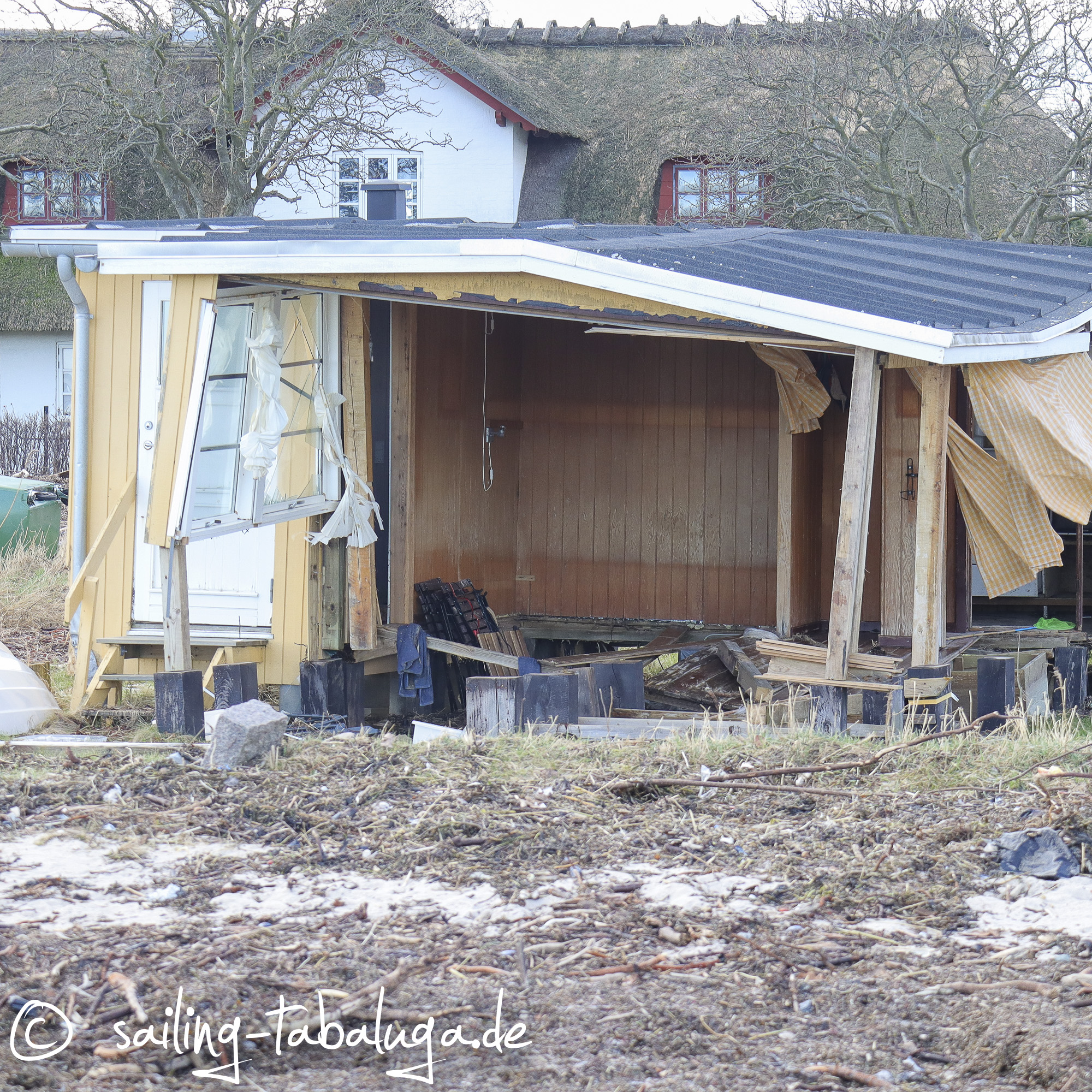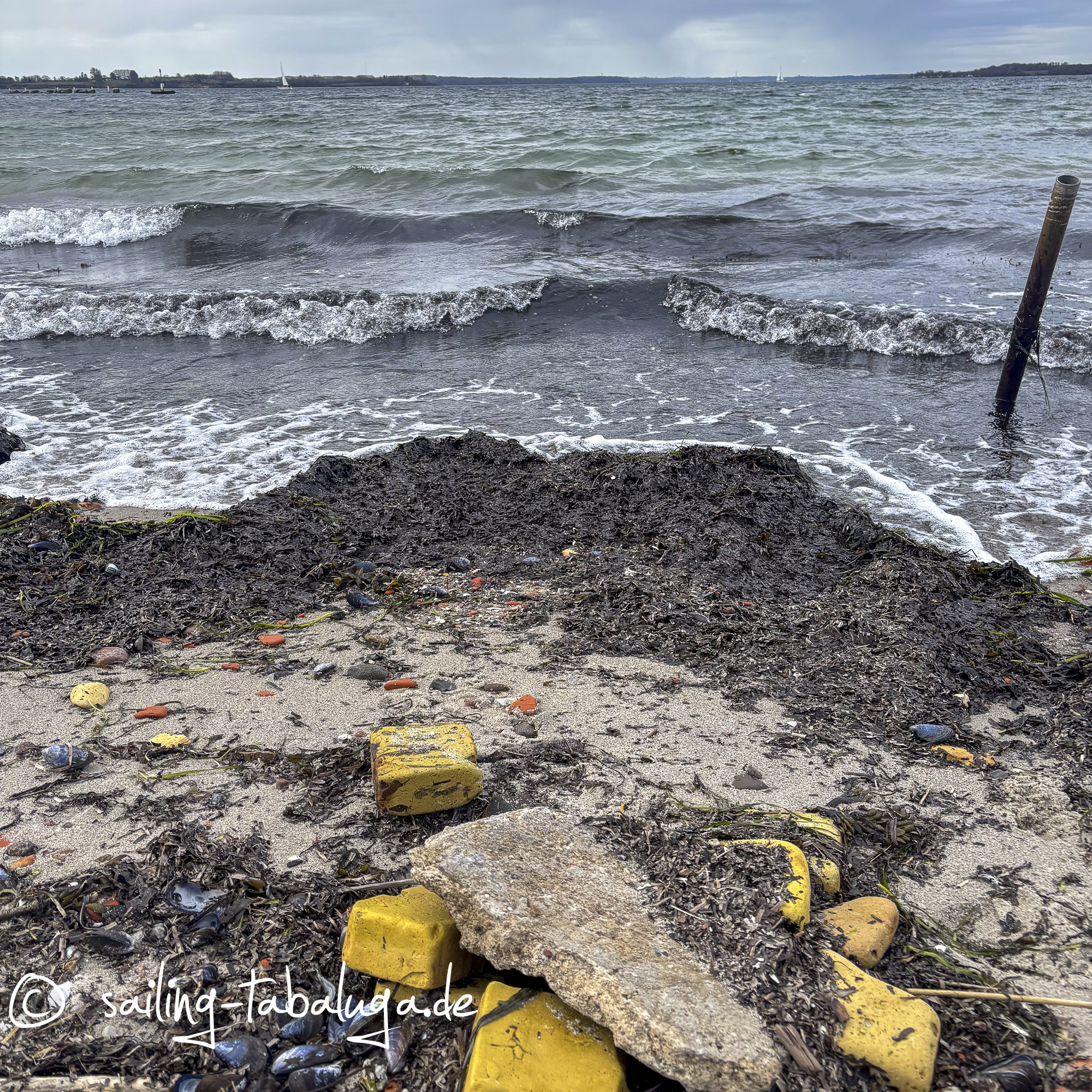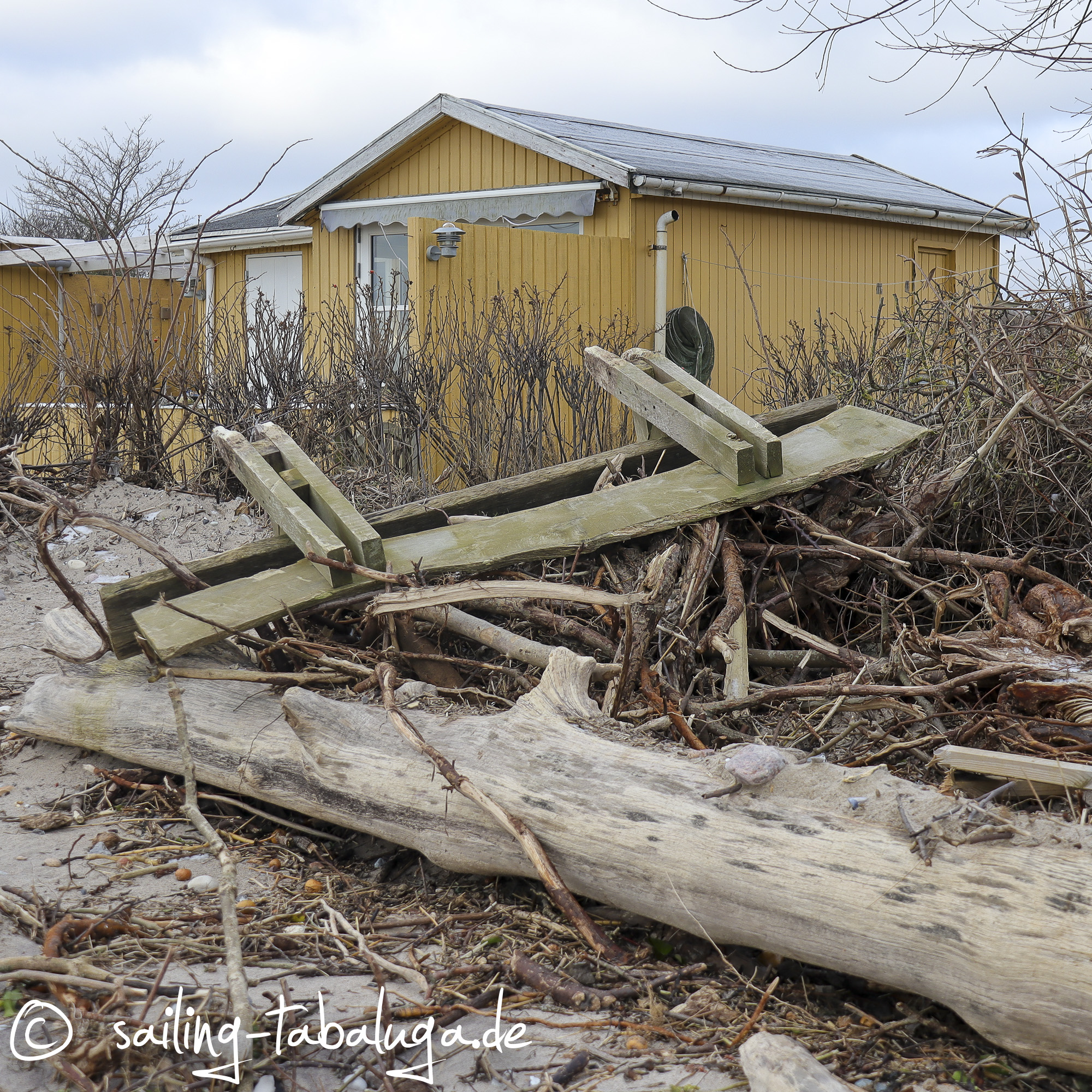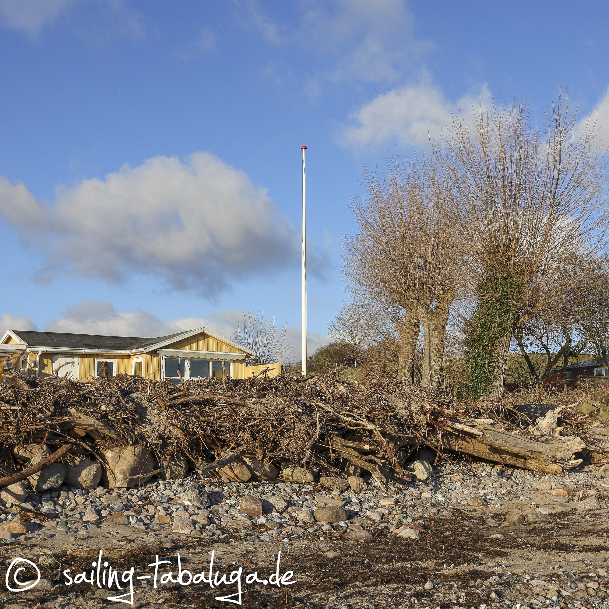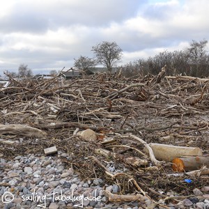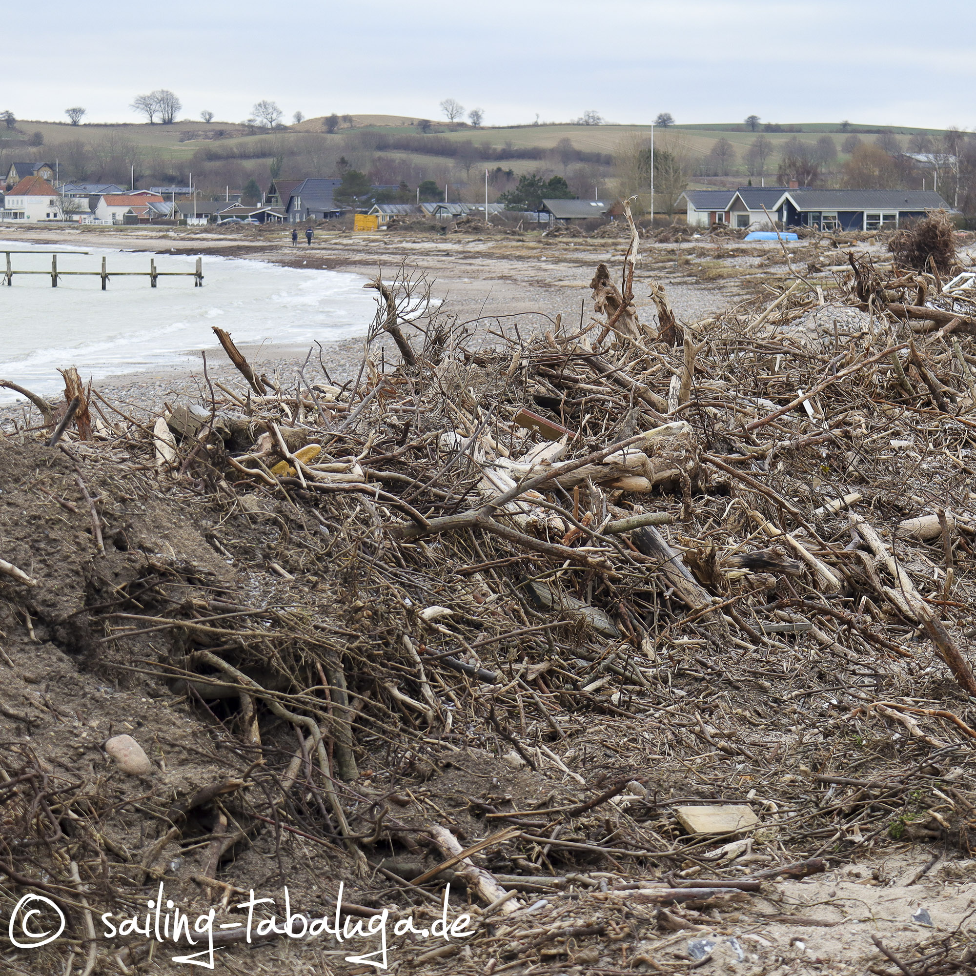 Entsetzt entdecken wir am Strand die Folgen der schweren Sturmflut im Oktober. Genau hier traf die aufgewühlte Ostsee auf Land und wie man auf den Bildern sieht, gaben Bäume, Zäune, Stege, Mauern und sogar Ferienhäuser nach. Unfassbar viel Müll und Holz liegt am Strand. Wir treffen einen Einheimischen mit seinem Hund und während die Hunde spielen, erzählt er uns, dass es Streitigkeiten gibt, wer nun für die Entsorgung des Mülls und der Trümmer zuständig ist. Die Gemeinde, die Eigentümer…? Er hofft, dass bis zum Sommer alles wieder einigermaßen in Ordnung kommt. Wir drücken alle Daumen und sind einfach nur froh, dass unserem Schiff nichts passiert ist.
