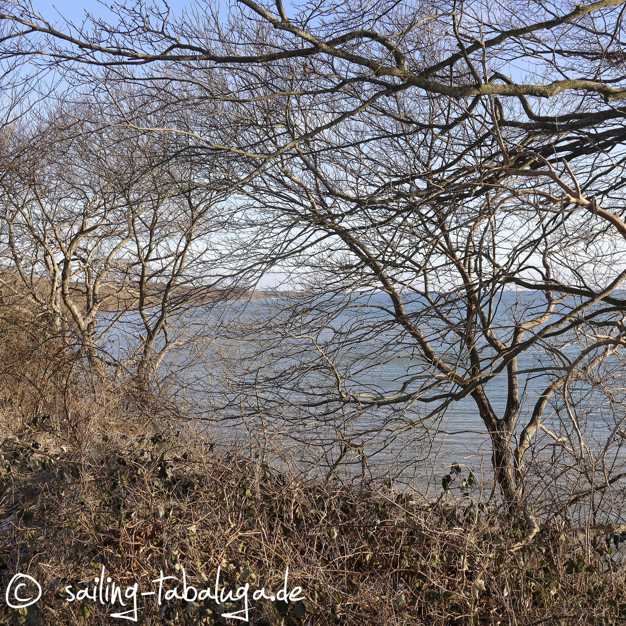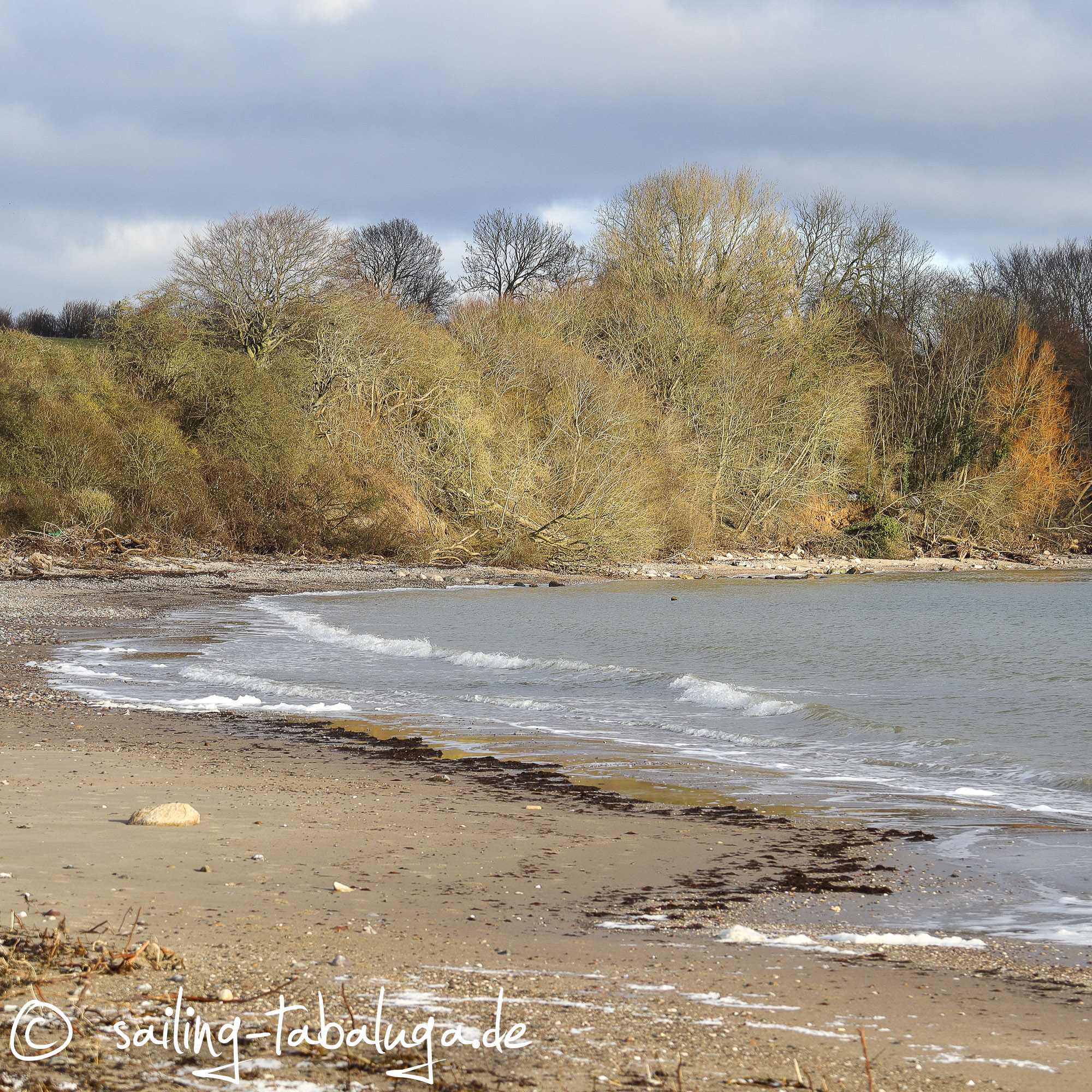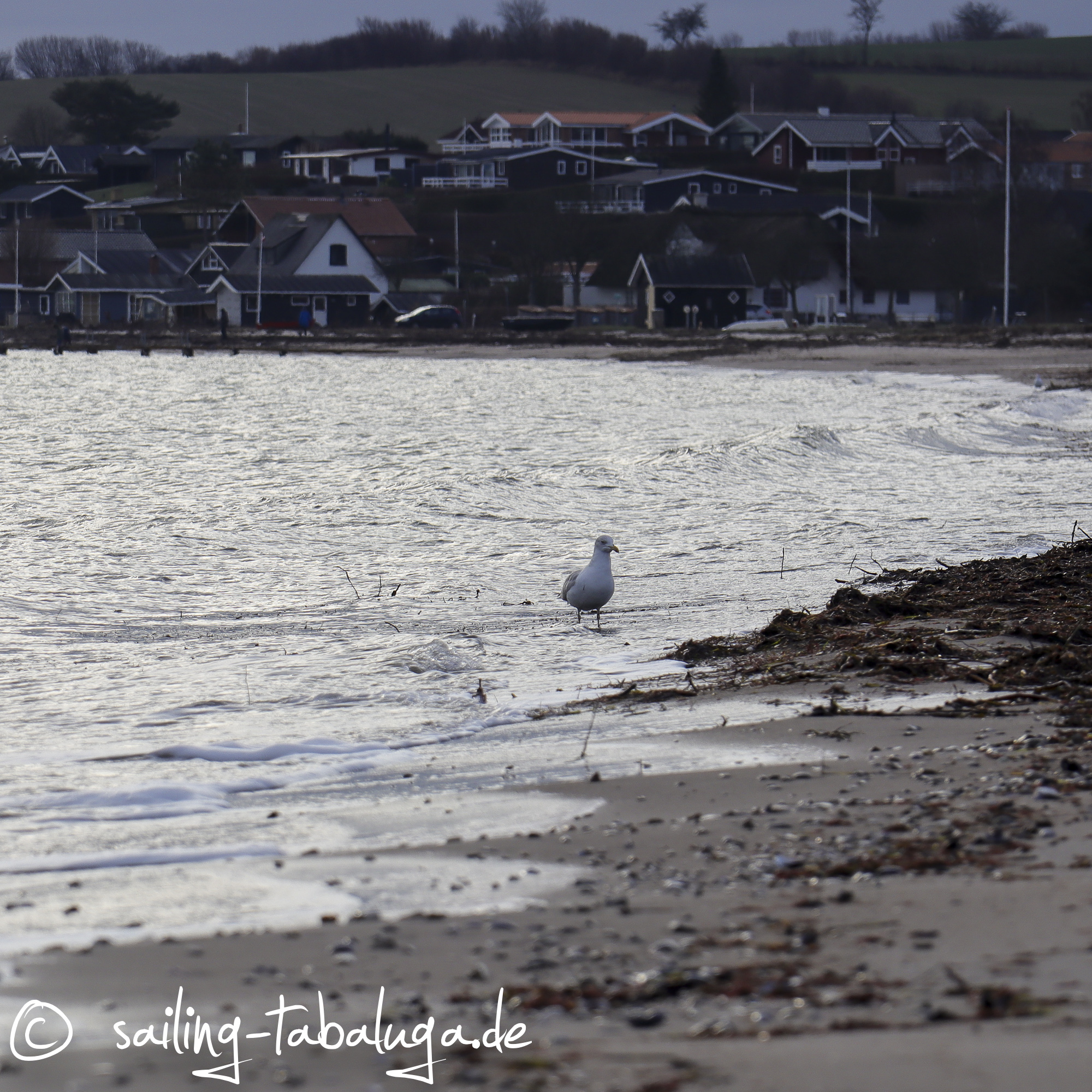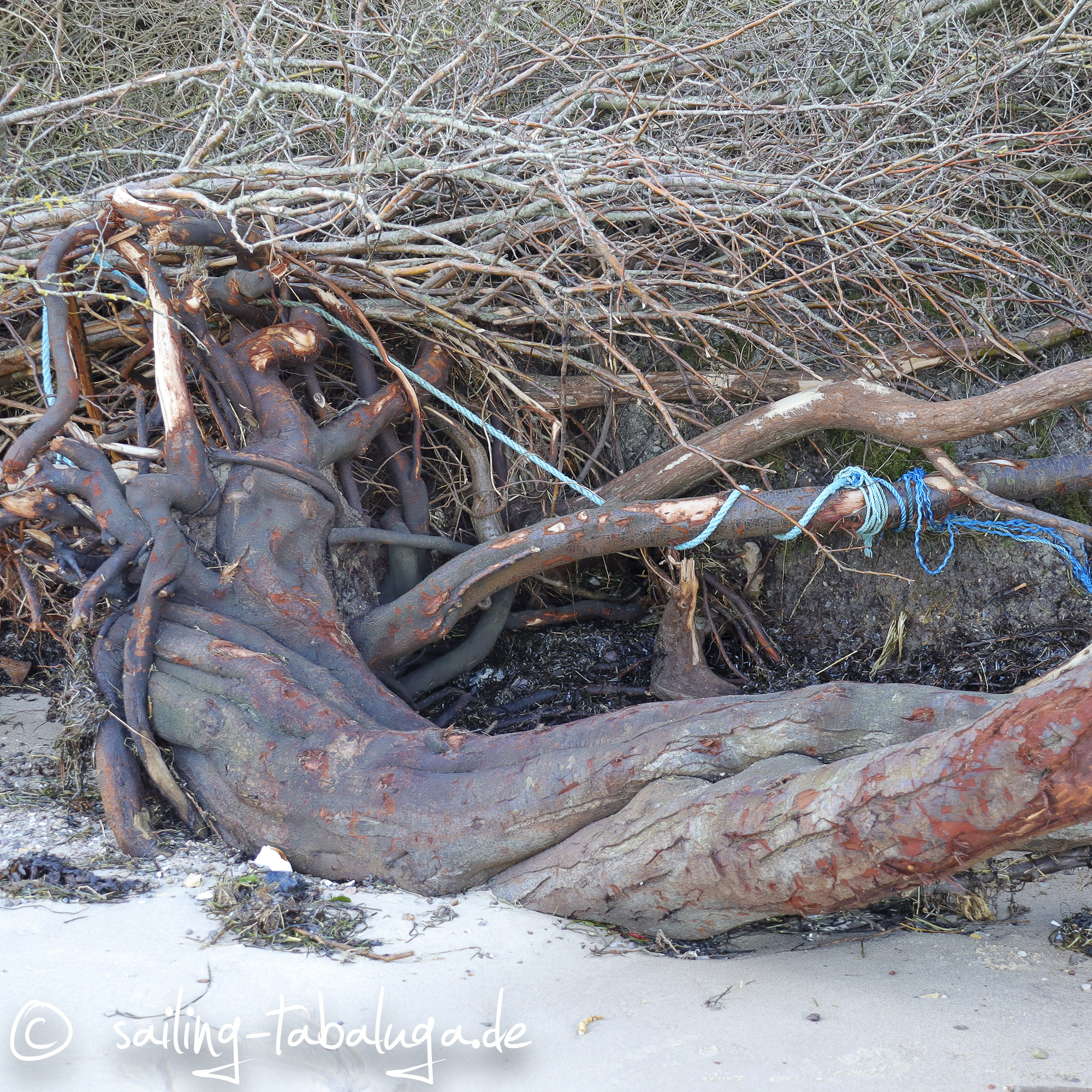 Entsetzt entdecken wir am Strand die Folgen der schweren Sturmflut im Oktober. Genau hier traf die aufgewühlte Ostsee auf Land und wie man auf den Bildern sieht, gaben Bäume, Zäune, Stege, Mauern und sogar Ferienhäuser nach. Unfassbar viel Müll und Holz liegt am Strand. Wir treffen einen Einheimischen mit seinem Hund und während die Hunde spielen, erzählt er uns, dass es Streitigkeiten gibt, wer nun für die Entsorgung des Mülls und der Trümmer zuständig ist. Die Gemeinde, die Eigentümer…? Er hofft, dass bis zum Sommer alles wieder einigermaßen in Ordnung kommt. Wir drücken alle Daumen und sind einfach nur froh, dass unserem Schiff nichts passiert ist.