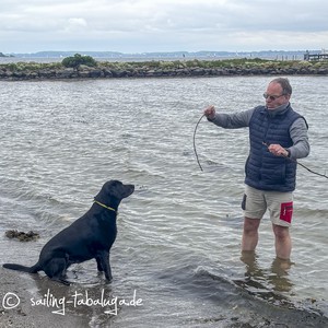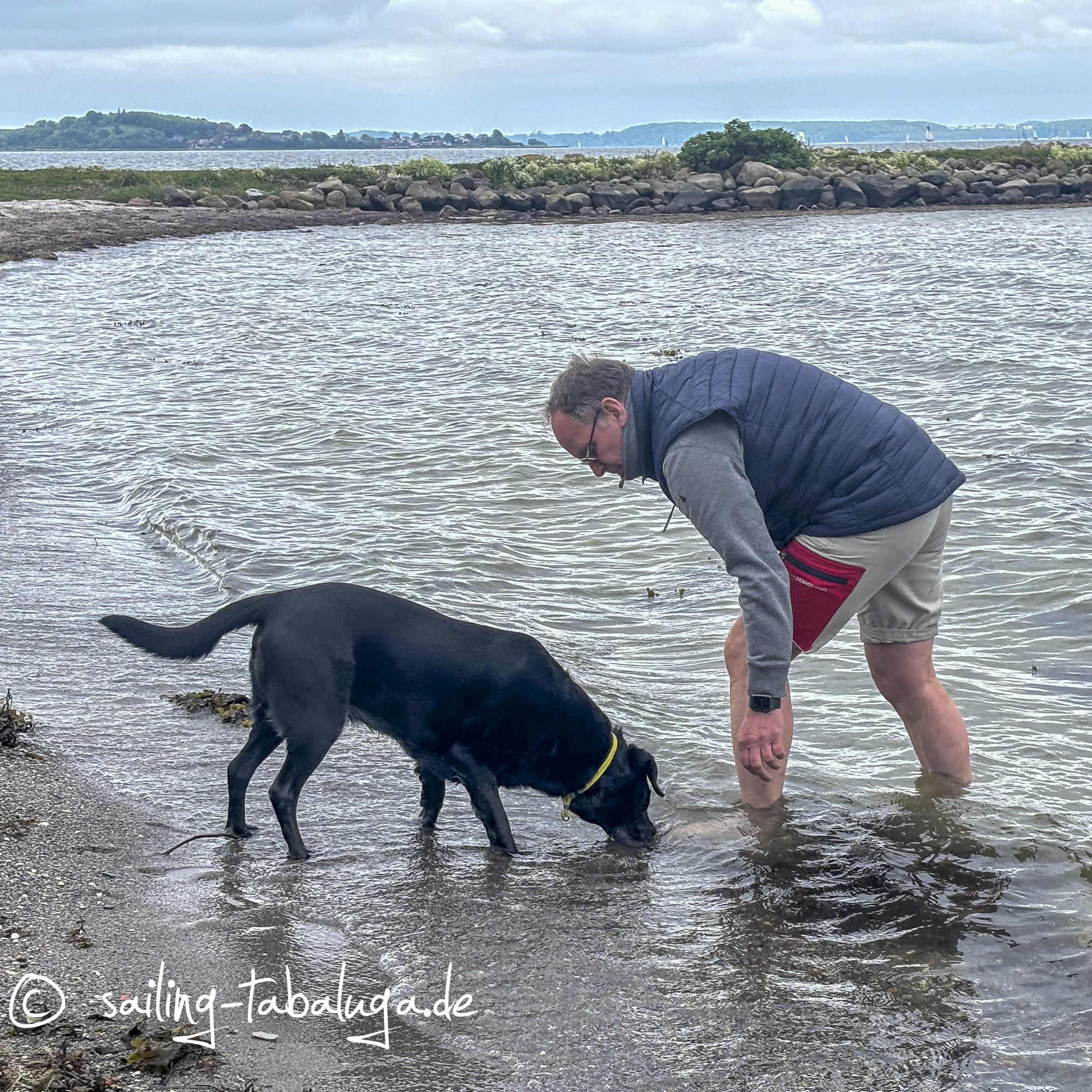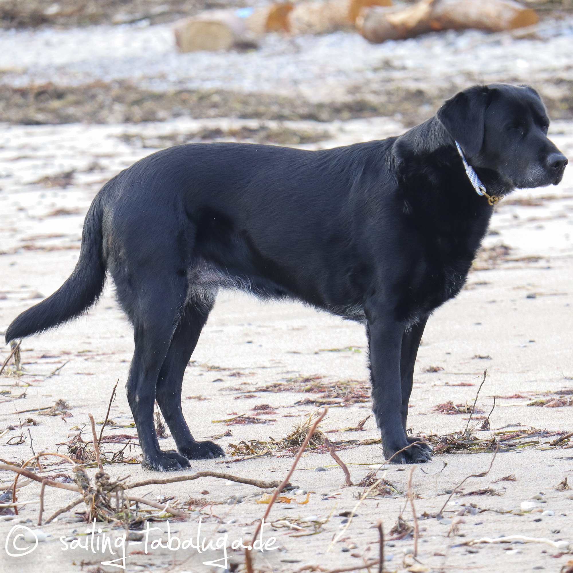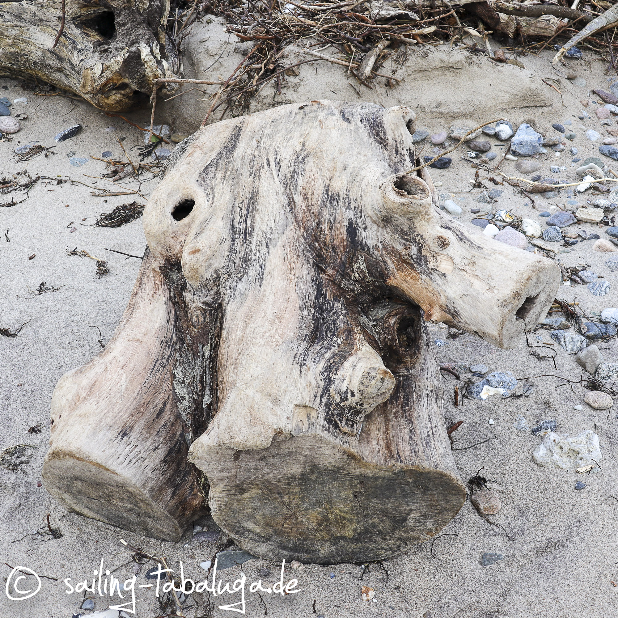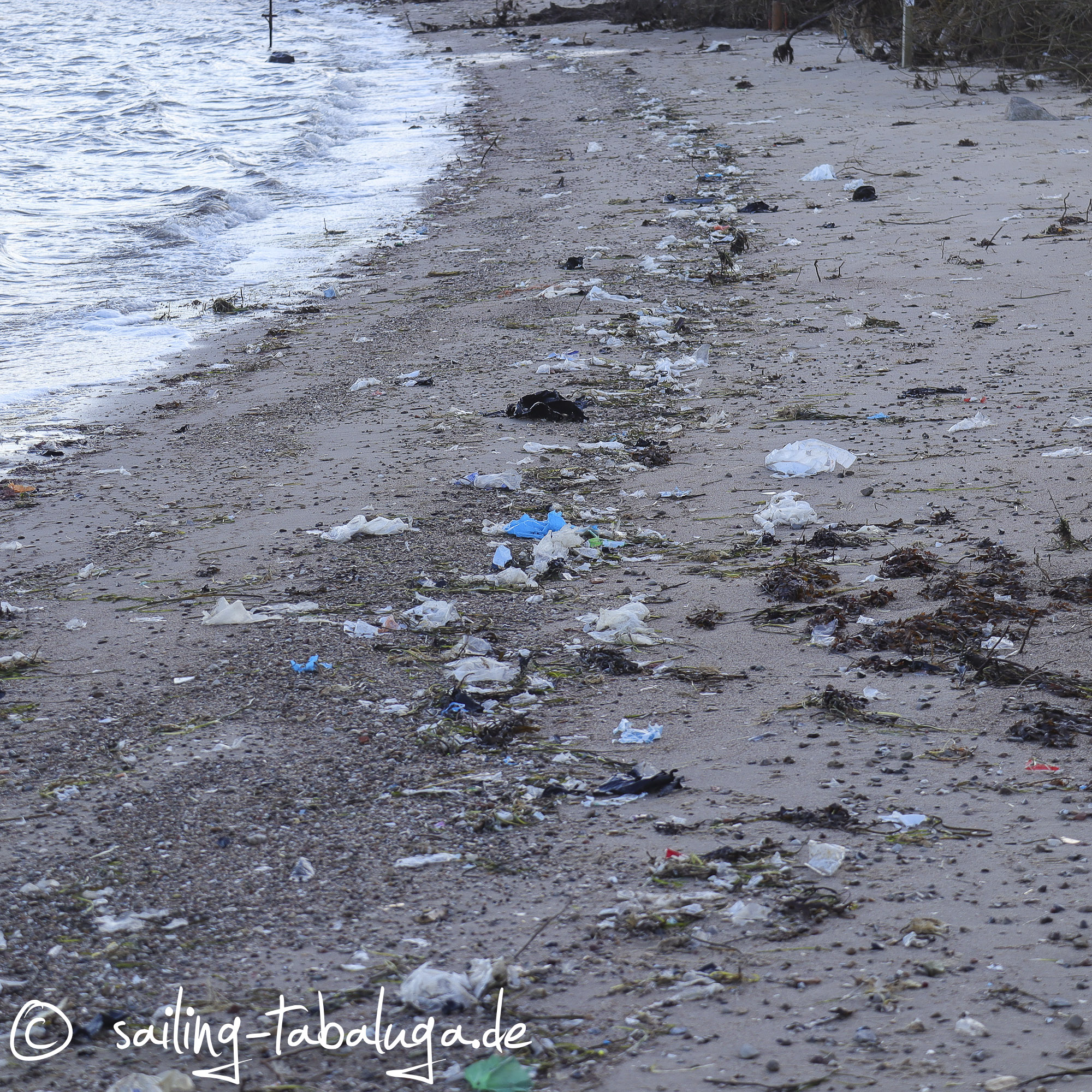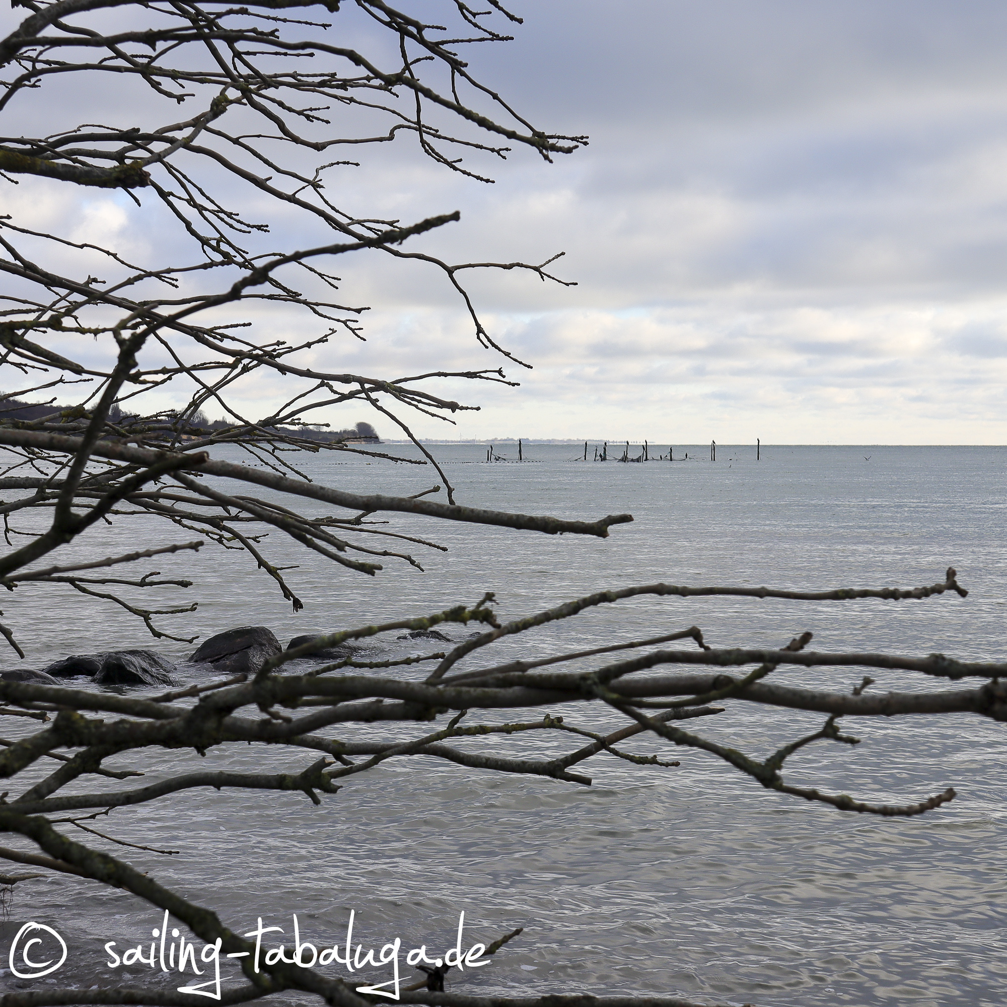 Entsetzt entdecken wir am Strand die Folgen der schweren Sturmflut im Oktober. Genau hier traf die aufgewühlte Ostsee auf Land und wie man auf den Bildern sieht, gaben Bäume, Zäune, Stege, Mauern und sogar Ferienhäuser nach. Unfassbar viel Müll und Holz liegt am Strand. Wir treffen einen Einheimischen mit seinem Hund und während die Hunde spielen, erzählt er uns, dass es Streitigkeiten gibt, wer nun für die Entsorgung des Mülls und der Trümmer zuständig ist. Die Gemeinde, die Eigentümer…? Er hofft, dass bis zum Sommer alles wieder einigermaßen in Ordnung kommt. Wir drücken alle Daumen und sind einfach nur froh, dass unserem Schiff nichts passiert ist.
