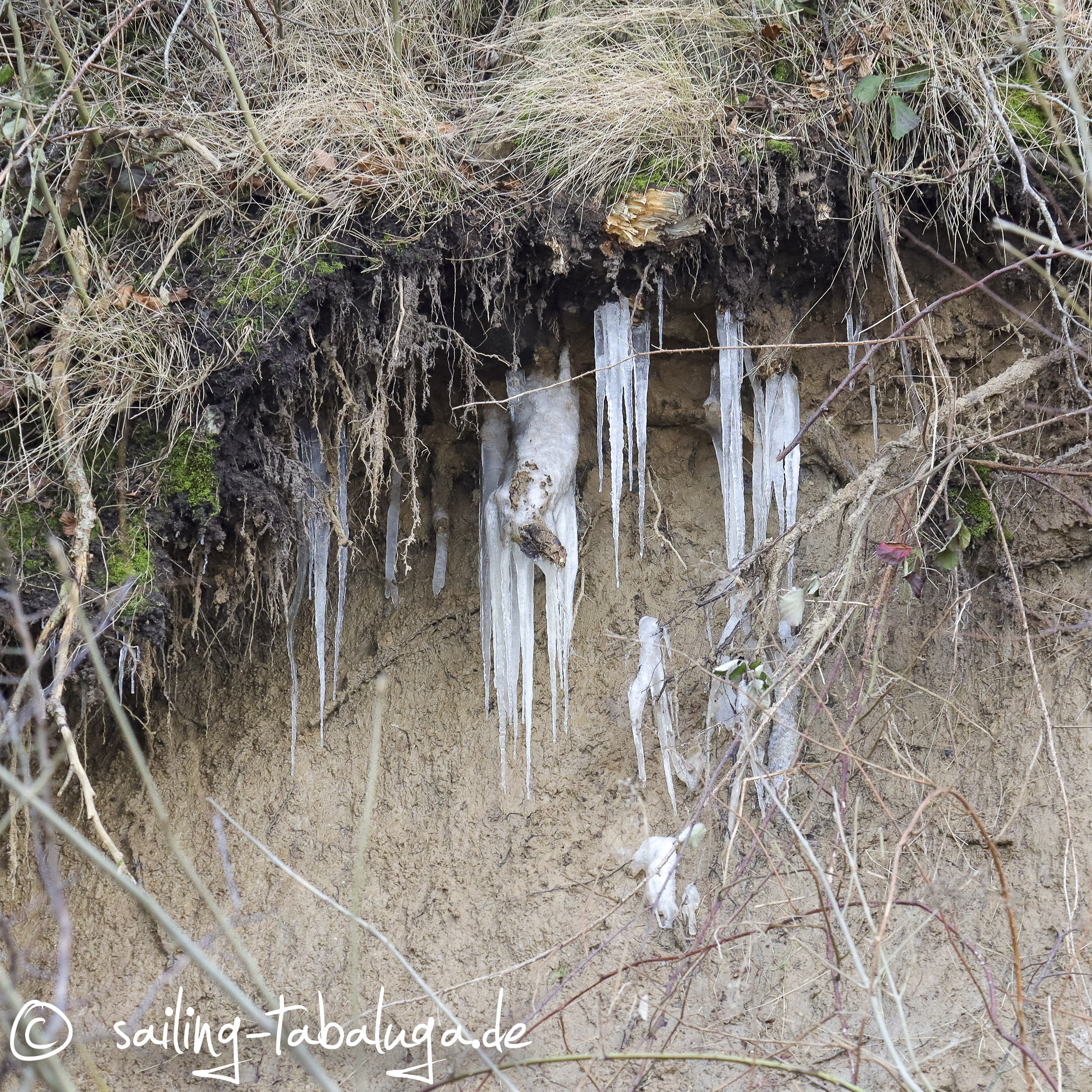 Ein Tag im Januar, deftige Minusgrade, wir wollen nach dem Rechten schauen, ob alles in Ordnung ist. Tabaluga geht’s gut an ihrem Liegeplatz in Marina Minde, aber es ist zu kalt, um an Bord zu bleiben. Wir beschränken uns auf einen Spaziergang an die Vemmingbund-Bucht nahe Sønderborg. Die winterliche Natur kreiert aus Eis wunderbare Figuren, ein leichter Schimmer der Sonne scheint durch die Wolken. Liese findet es wie immer super, solange sie sich bewegen kann, ist ihr ja auch nicht kalt.